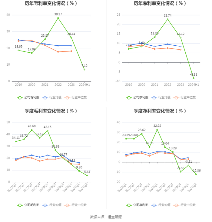 2024年上半年,公司毛利率为7.12%,同比下降27.02个百分点;净利率为-8.31%,较上年同期下降31.37个百分点。从单季度指标来看,2024年第二季度公司毛利率为5.43%,同比下降21.38个百分点,环比下降3.77个百分点;净利率为-12.36%,较上年同期下降27.40个百分点,较上一季度下降9.05个百分点。