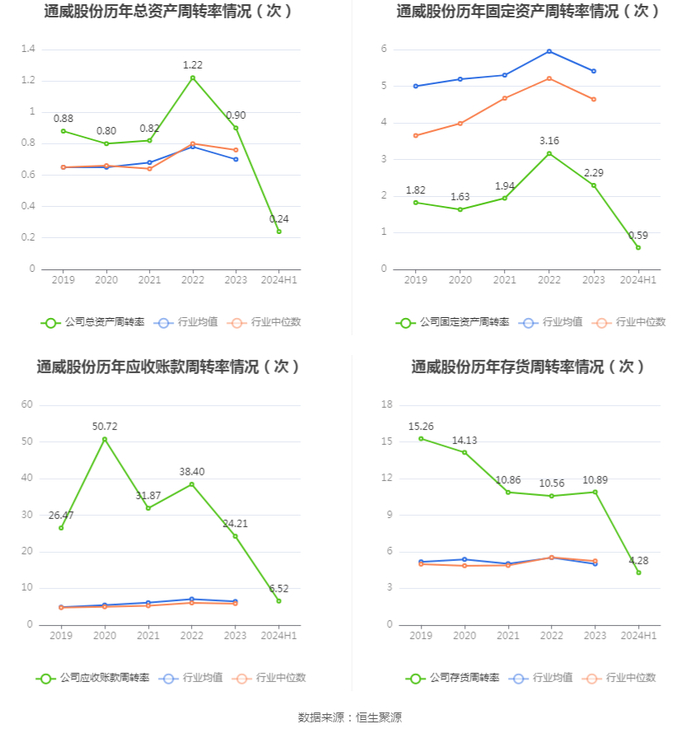 营运能力方面,2024年上半年,公司总资产周转率为0.24次,上年同期为0.49次(2023年上半年行业平均值为0.36次,公司位居同行业19/66);固定资产周转率为0.59次,上年同期为1.38次(2023年上半年行业平均值为2.90次,公司位居同行业50/66);公司应收账款周转率、存货周转率分别为6.52次、4.28次。