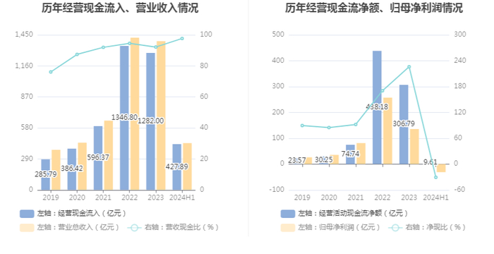 2024年上半年,公司经营活动现金流净额为9.61亿元,同比下降95.46%;筹资活动现金流净额198.02亿元,同比增加300.32亿元;投资活动现金流净额-168.84亿元,上年同期为-260.57亿元。