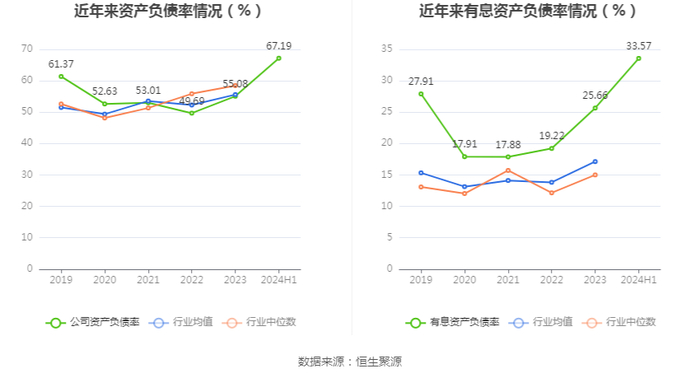 在偿债能力方面,公司2024年上半年末资产负债率为67.19%,相比上年末上升12.11个百分点;有息资产负债率为33.57%,相比上年末上升7.91个百分点。