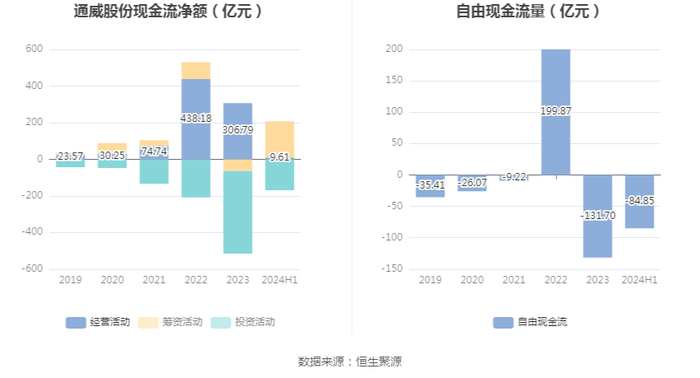 进一步统计发现,2024年上半年公司自由现金流为-84.85亿元,上年同期为71.97亿元。