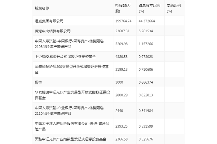 半年报显示,2024年上半年末公司十大流通股东中,新进股东为中国太平洋人寿保险股份有限公司-传统-普通保险产品、天弘中证光伏产业指数型发起式证券投资基金,取代了一季度末的睿远成长价值混合型证券投资基金、全国社保基金一一零组合。在具体持股比例上,通威集团有限公司、香港中央结算有限公司、华泰柏瑞沪深300交易型开放式指数证券投资基金、华泰柏瑞中证光伏产业交易型开放式指数证券投资基金持股有所上升,中国人寿资管-中国银行-国寿资产-优势甄选2108保险资产管理产品、上证50交易型开放式指数证券投资基金、杨林持股有所下降。