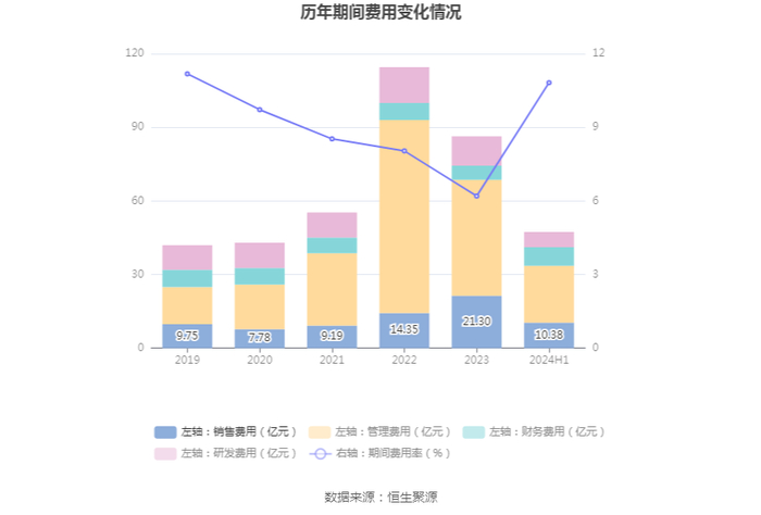 2024年上半年,公司期间费用为47.40亿元,较上年同期增加10.18亿元;期间费用率为10.82%,较上年同期上升5.80个百分点。其中,销售费用同比增长32.41%,管理费用同比增长12.83%,研发费用同比下降6.74%,财务费用同比增长252.81%。