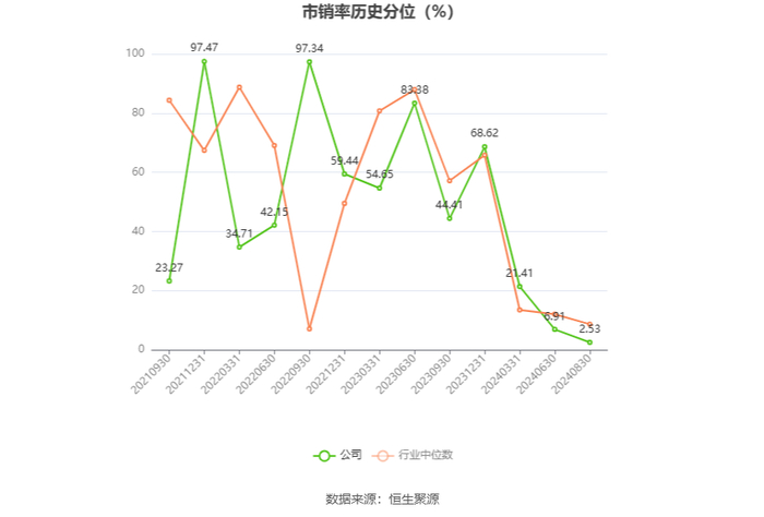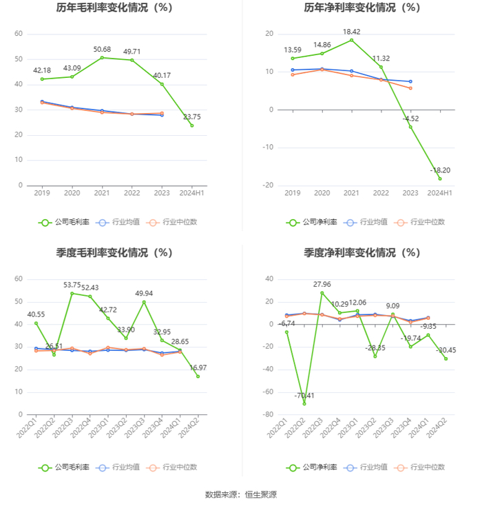 2024年上半年,公司毛利率为23.75%,同比下降16.02个百分点;净利率为-18.20%,较上年同期下降16.77个百分点。从单季度指标来看,2024年第二季度公司毛利率为16.97%,同比下降16.93个百分点,环比下降11.68个百分点;净利率为-30.45%,较上年同期下降2.10个百分点,较上一季度下降21.10个百分点。