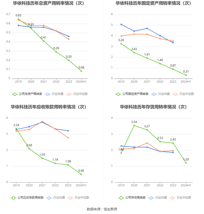 营运能力方面,2024年上半年,公司总资产周转率为0.08次,上年同期为0.10次(2023年上半年行业平均值为0.22次,公司位居同行业78/84);固定资产周转率为0.31次,上年同期为0.55次(2023年上半年行业平均值为1.64次,公司位居同行业78/84);公司应收账款周转率、存货周转率分别为0.49次、1.20次。