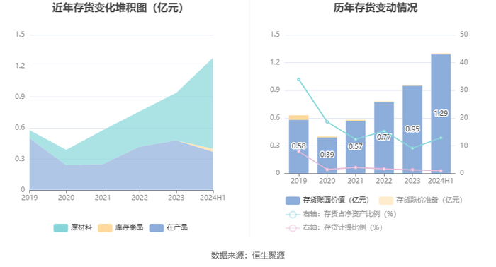 从存货变动来看,截至2024年上半年末,公司存货账面价值为1.29亿元,占净资产的12.87%,较上年末增加3390.03万元。其中,存货跌价准备为127.54万元,计提比例为0.98%。