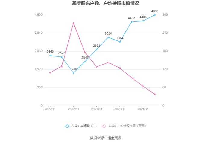 筹码集中度方面,截至2024年上半年末,公司股东总户数为4800户,较一季度末增长了314户,增幅7.00%;户均持股市值由一季度末的64.38万元下降至38.28万元,降幅为40.54%。