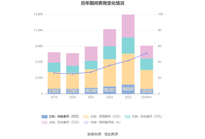 2024年上半年,公司期间费用为8999.49万元,较上年同期增加2011.01万元;期间费用率为51.31%,较上年同期上升6.16个百分点。其中,销售费用同比增长31.71%,管理费用同比增长27.08%,研发费用同比增长21.52%,财务费用同比增长40.05%。