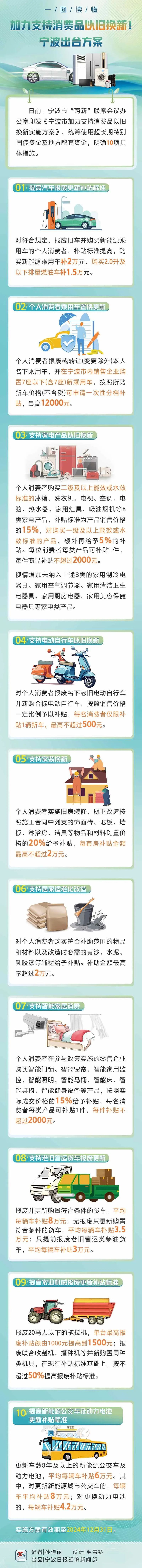 宁波在上一阶段支持个人消费者乘用车报废更新、家电以旧换新基础上,新增支持个人乘用车置换更新,居家适老化改造,电动自行车以旧换新,旧房装修、厨卫改造等物品和材料购置,智能家居消费。