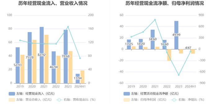 2024年上半年,公司经营活动现金流净额为4.47亿元,同比下降89.47%,主要系销售回款减少所致;筹资活动现金流净额-4.14亿元,同比增加35.59亿元,主要系偿还债务支付的现金减少所致;投资活动现金流净额3.15亿元,上年同期为2.27亿元,主要系收回投资收到的现金增加所致。