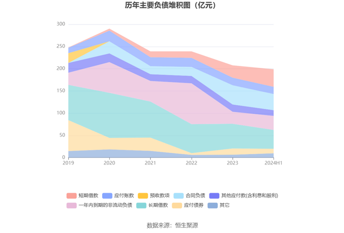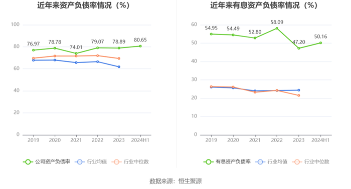 在偿债能力方面,公司2024年上半年末资产负债率为80.65%,相比上年末上升1.76个百分点;有息资产负债率为50.16%,相比上年末上升2.96个百分点。