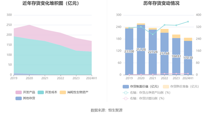 从存货变动来看,截至2024年上半年末,公司存货账面价值为170.3亿元,占净资产的356.27%,较上年末减少14.51亿元。其中,存货跌价准备为16.06亿元,计提比例为8.62%。