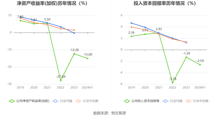 数据显示,2024年上半年公司加权平均净资产收益率为-15.00%,较上年同期下降11.60个百分点;公司2024年上半年投入资本回报率为-2.59%,较上年同期下降2.93个百分点。