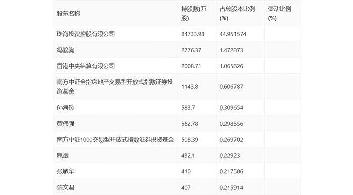 半年报显示,2024年上半年末公司十大流通股东中,新进股东为扈斌、张敏华、陈文君,取代了一季度末的格力地产股份有限公司-第六期员工持股计划、董文顺、赵静明。在具体持股比例上,冯骏驹、香港中央结算有限公司、南方中证全指房地产交易型开放式指数证券投资基金、黄伟强、南方中证1000交易型开放式指数证券投资基金持股有所上升。
