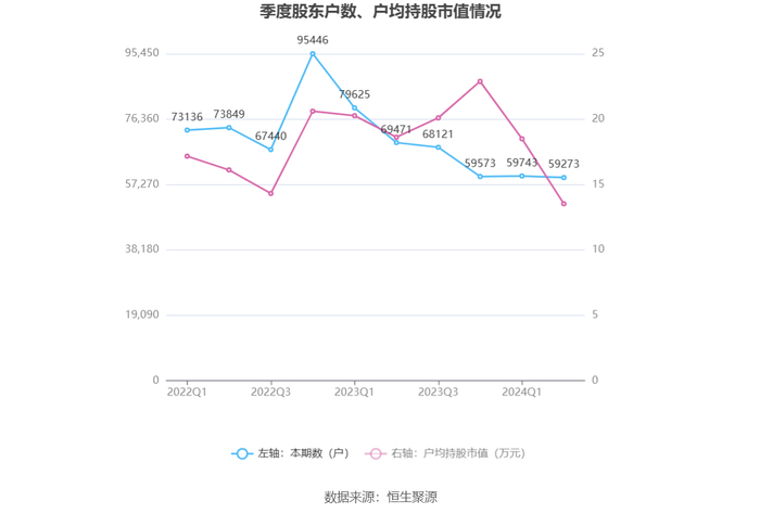 筹码集中度方面,截至2024年上半年末,公司股东总户数为5.93万户,较一季度末下降了470户,降幅0.79%;户均持股市值由一季度末的18.49万元下降至13.52万元,降幅为26.88%。
