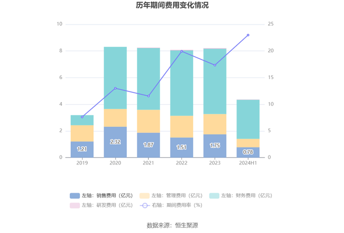 2024年上半年,公司期间费用为4.35亿元,较上年同期增加5199.44万元;期间费用率为22.99%,较上年同期上升2.33个百分点。其中,销售费用同比增长12.35%,管理费用同比下降21.35%,研发费用同比增长2.57%,财务费用同比增长25.94%。