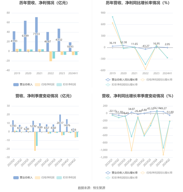 根据半年报,公司第二季度实现营业总收入4.18亿元,同比下降51.80%,环比下降71.68%;归母净利润-6.74亿元,同比下降203.82%,环比下降557.04%;扣非净利润-6.15亿元,同比下降218.31%,环比下降341.45%。