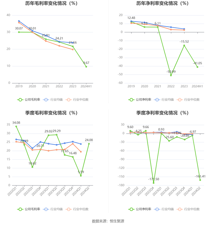 2024年上半年,公司毛利率为9.67%,同比下降19.47个百分点;净利率为-41.05%,较上年同期下降29.59个百分点。从单季度指标来看,2024年第二季度公司毛利率为24.08%,同比下降5.21个百分点,环比上升18.49个百分点;净利率为-161.41%,较上年同期下降135.81个百分点,较上一季度下降154.44个百分点。