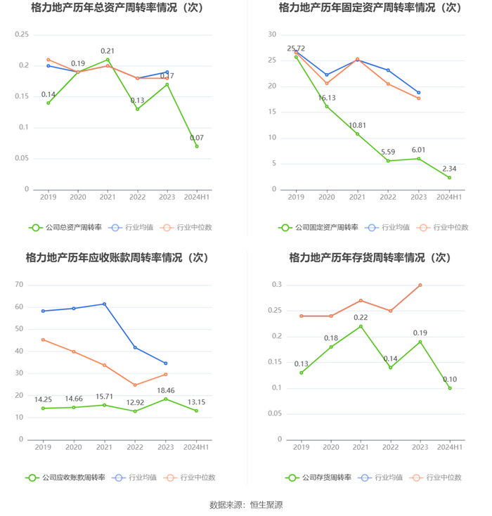 营运能力方面,2024年上半年,公司总资产周转率为0.07次,上年同期为0.06次(2023年上半年行业平均值为0.07次,公司位居同行业49/79);固定资产周转率为2.34次,上年同期为2.49次(2023年上半年行业平均值为8.45次,公司位居同行业58/79);公司应收账款周转率、存货周转率分别为13.15次、0.10次。