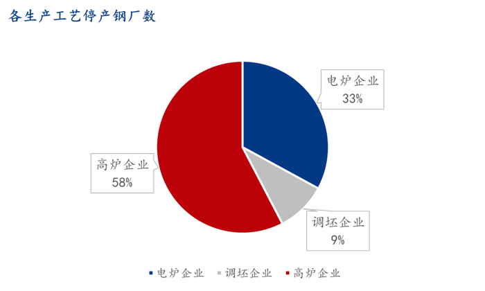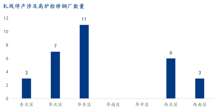分生产工艺看,高炉企业停产数量占比超过一半,共49家,占比达到58%;此外电炉企业28家,占比33%、调坯企业8家,占比9%。高炉企业中,共30家钢厂存在高炉同步检修情况,主要集中在华东、华北、西北地区;东北、西南数量较少。