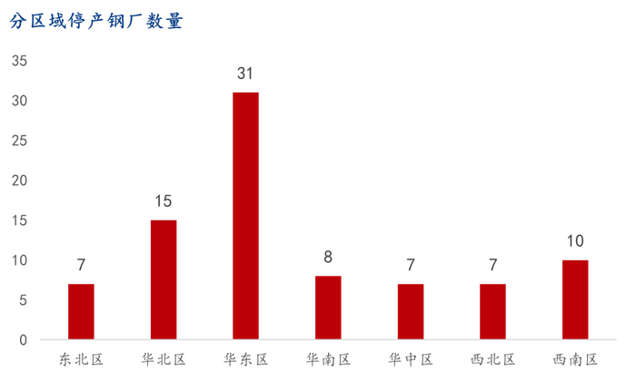 近几月,受到螺纹新旧国标切换以及钢厂盈利率大幅下降影响,全国共85家螺纹钢生产企业选择全部停产或者部分停产,华东31家、华北15家、西南10家,其他区域也各有检修。