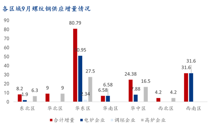 2、 9月复产钢厂预计带来螺纹钢供应增量约164.75万吨,按区域由多至少排序,分别为华东、西南、华中、华北、东北、华南、西北。