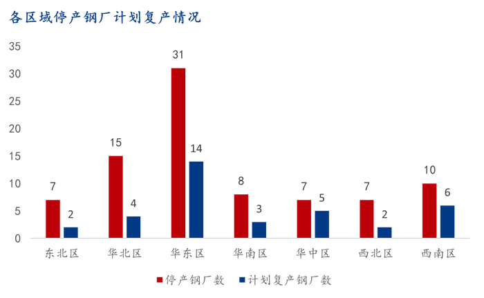 据调研,9月共36家钢厂存在复产计划,分区域来看,华东14家、西南6家、华中5家、华北4家、华南3家、东北西北共4家。分工艺来看,由于生产灵活等特点,电炉企业率先复产,且主要集中在华东、西南地区,共20家,占比56%;高炉企业占比39%;调坯企业占比6%。