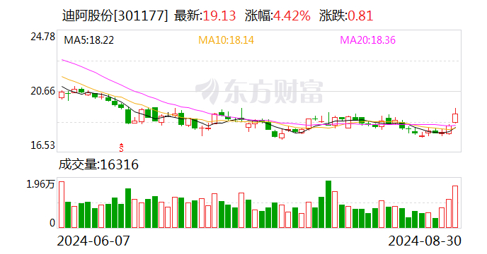 半年报发布次日,迪阿股份放量上行,收盘上涨4.42%,全天交易额达到3103.65万元,较上一交易日增加超千万元。8月28日开始,迪阿股份已连续三个交易日上涨,累计涨幅达到7.47%。
