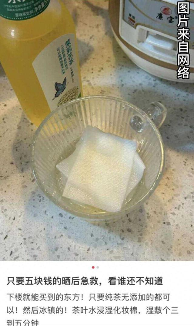 在网上火爆的消息是“只要五块钱的晒后急救”,网友分享的具体做法是用冰镇的东方树叶纯茶无添加的饮料,湿敷在脸上就能快速补水,还能起到抗氧化、镇静退红、收敛毛孔的作用。网友们说,这很健康,因为饮料的配料表就只知道,水、茶叶、维生素C、碳酸氢钠。不过这看似健康的做法在医生看来并不靠谱。