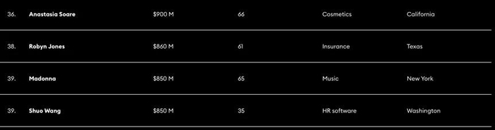 身价8.5亿美金和天皇巨星麦当娜并列第39名,约等于63亿人民币。