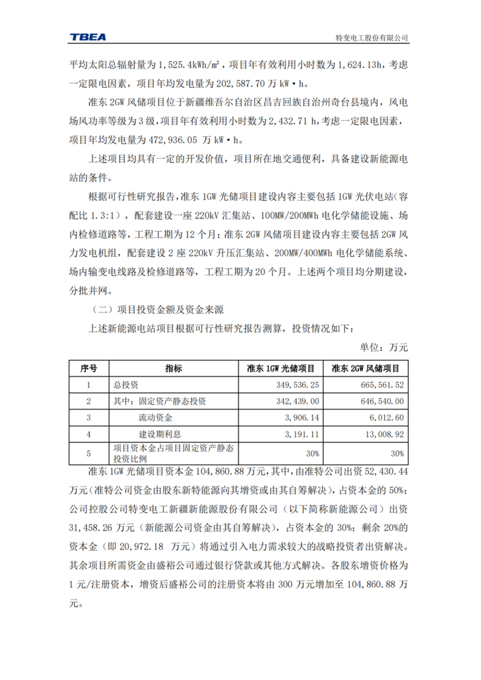 公告指出,为抢抓市场机遇,加快风光资源的开发,公司分别以控股公司昌吉州盛裕新能源发电有限公司(以下简称盛裕公司)为主体投资建设准东1GW光储项目,以控股公司昌吉州盛鼎新能源发电有限公司(以下简称盛鼎公司)为主体投资建设准东2GW风储项目。准东1GW光储项目总投资349,536.25万元,准东2GW风储项目总投资665,561.52万元。
