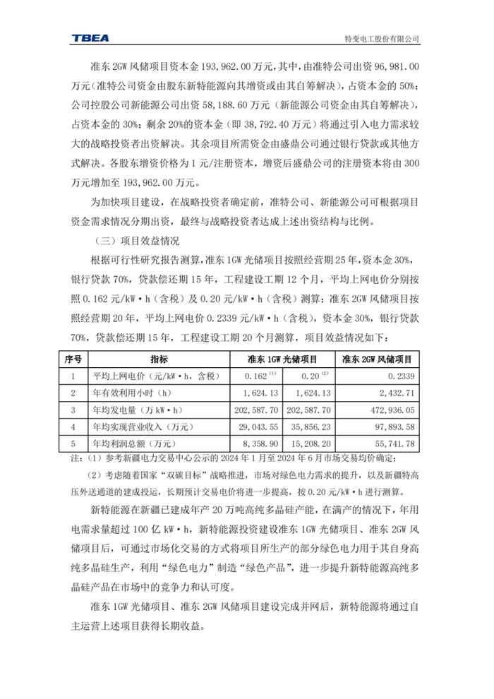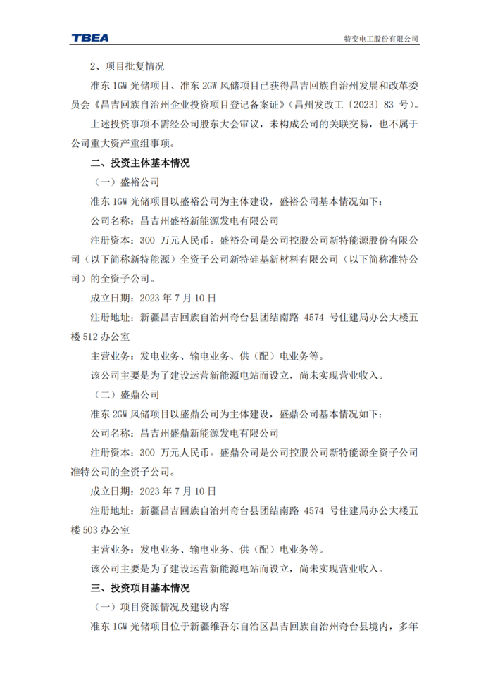 准东2GW风储项目以盛鼎公司为主体建设,盛鼎公司是特变电工控股公司新特能源全资子公司准特公司的全资子公司,成立于2023年7月10日,主营业务为发电业务、输电业务、供(配)电业务等。该公司主要是为了建设运营新能源电站而设立,尚未实现营业收入。