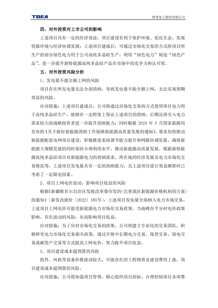 特变电工表示,上述项目具有一定的经济效益,项目建设有利于保护环境、优化生态,实现资源环境与经济协调发展;上述项目建成后,可通过市场化交易的方式将项目所生产的部分绿色电力用于公司高纯多品硅生产,利用“绿色电力”制造“绿色产品”,进一步提升新特能源高纯多品硅产品在市场中的竞争力和认可度。详情见下: