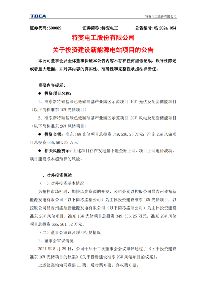 风芒能源获悉,8月29日,特变电工发布关于投资建设新能源电站项目的公告。