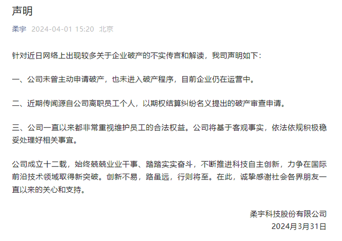 据了解,柔宇科技近两年来一直面临着破产、员工罢工讨薪的诸多传闻。而在今年4月1日,柔宇科技甚至还在其公众号上发布声明称,公司未曾主动申请破产,也未进入破产程序,目前企业仍在运营中;近期传闻源自公司离职员工个人,以期权结算纠纷名义提出的破产审查申请。