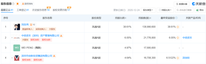 据天眼查,目前,刘自鸿仍然是柔宇科技的最大股东,持股为38.61%,第二大股东为中信资本(深圳)资产管理有限公司,持股6.05%。