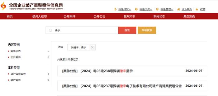 此前,6月7日,全国企业破产重整案件信息网显示,6月6日,深圳市中级人民法院发布公告称,该法院已于2024年5月15日裁定受理柔宇科技破产清算一案,并指定广东华商律师事务所为柔宇科技管理人。