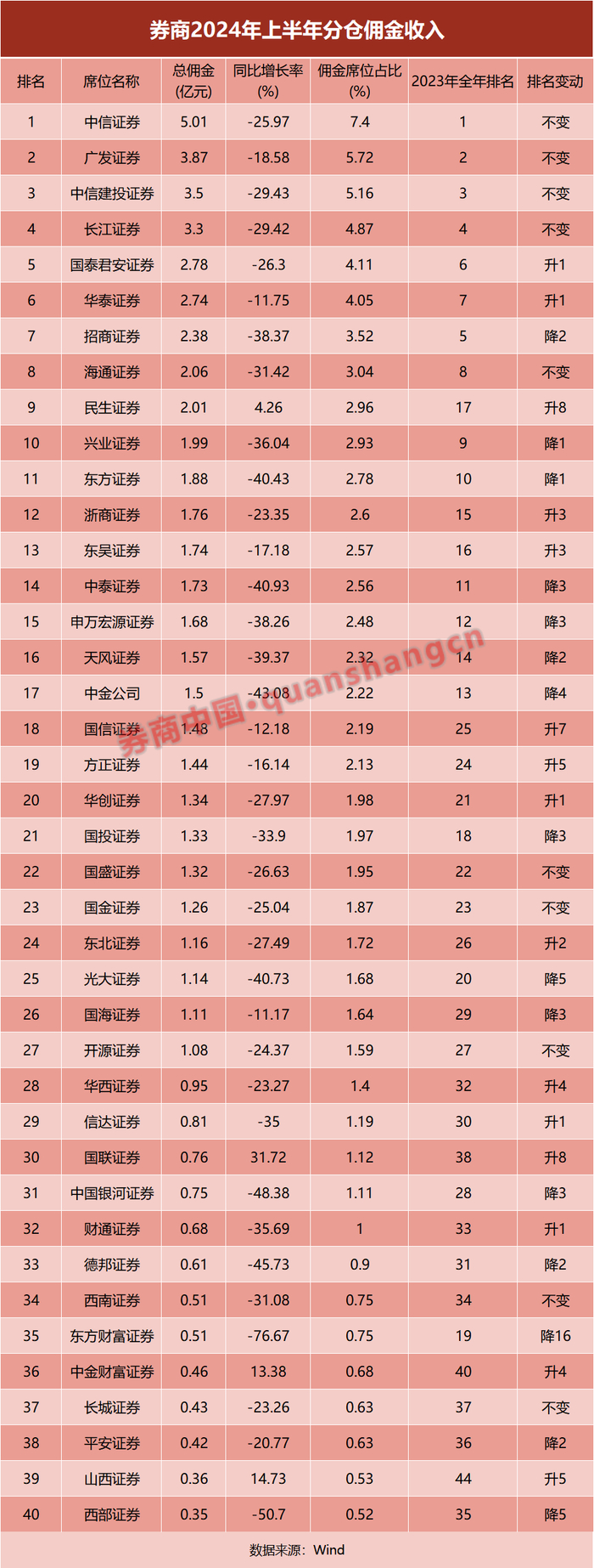 随着公募基金半年报披露季落幕,券商2024年上半年分仓佣金收入成绩单出炉。