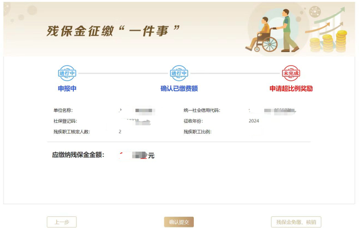 2.需缴纳残保金单位页面中显示“应缴纳残保金金额”,点击“确认提交”确认信息后,跳转电子税务局进行缴费。