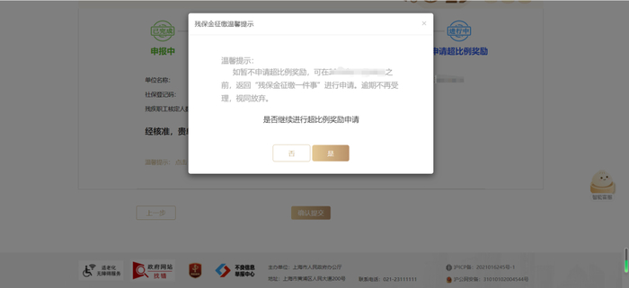 超比例奖励单位无需缴纳残保金,点击“确认提交”按钮后,可根据提示选择是否继续进行超比例奖励申请。