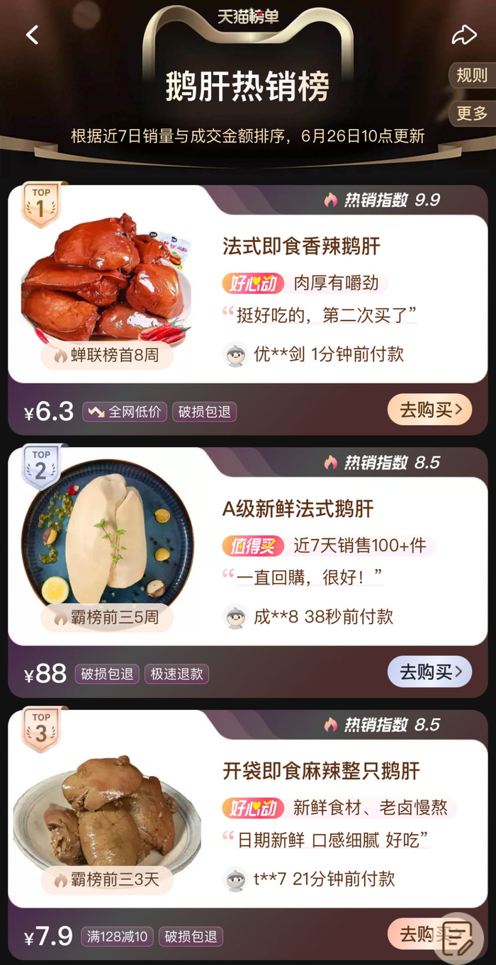 网上渠道也起来了。自从年初两地的鹅肝隐藏特产被“开盒”后,网店迎来了一波销量增长,临朐的从业人员称日营业额估计在一两万元。我去看了看天猫的鹅肝热销榜,依然有源源不断的买家光顾。