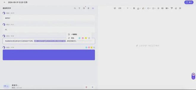 不仅可以很好地区分发言人,根据不同发言人整理核心观点,而且,用户可以边听边选中文段,自己划重点。