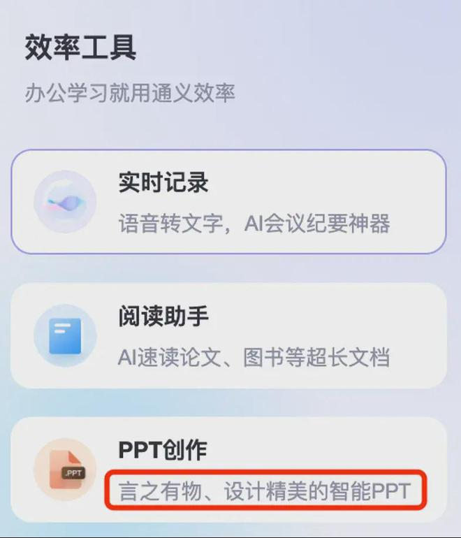通义直接在网页版里上新了“效率”版块,功能很直给:实时记录、阅读助手,还有PPT创作。
