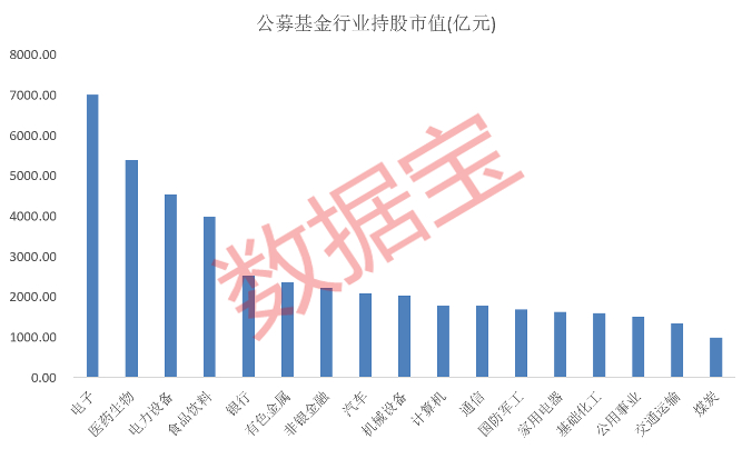 从行业上看,公募基金持股主要集中在电子、医药生物、电力设备、食品饮料行业,持股市值依次为7015.25亿元、5402.91亿元、4543.69亿元、3998.83亿元。此外,银行、有色金属、非银金融、汽车、机械设备等行业,持股市值均在2000亿元以上。