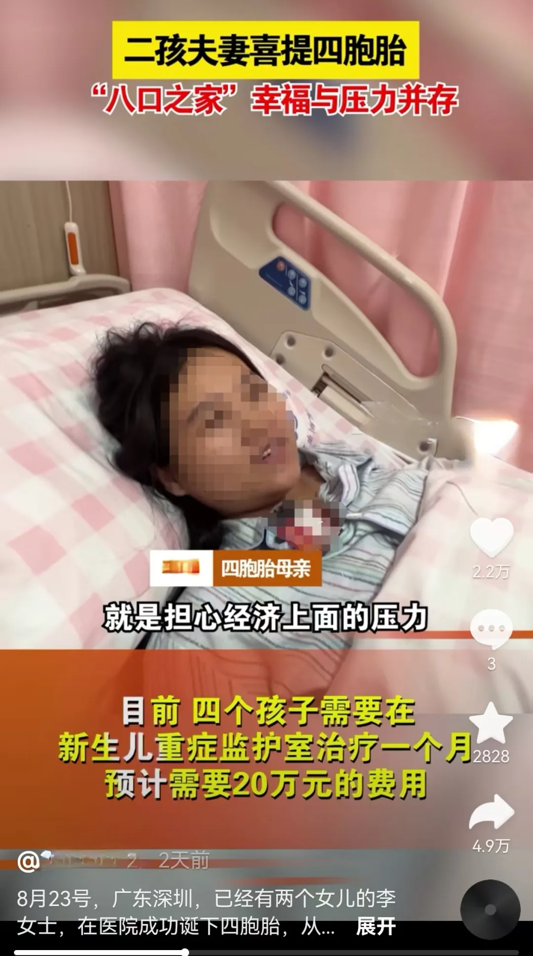据深圳广播电视台第一现场报道,8月23日,产妇李女士在深圳成功诞下四胞胎,一家人既开心又压力大。父亲陈先生介绍说,四胞胎出生前,家里已经有两个女儿,现在妻子需要放弃工作照顾孩子,家庭经济重担全落在了他的肩头。他接受采访时称,目前,四胞胎需要在重症监护室治疗一个月,预计需要20万元费用。虽然后期可在户籍所在地社保报销费用的80%,但眼前这20万元怎么都拿不出。“我是一个打工族,收入方面比较微薄,真的是没办法了,希望社会提供帮助。”
