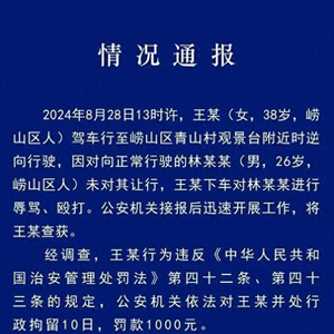 崂山区警方此前通报称,2024年8月28日13时许,王某(女,38岁,崂山区人)驾车行至崂山区青山村观景台附近时逆向行驶,因对向正常行驶的林某某(男,26岁,崂山区人)未对其让行,王某下车对林某某进行辱骂、殴打。经调查,王某的行为违反《中华人民共和国治安管理处罚法》第四十二条、第四十三条的规定,公安机关依法对王某并处行政拘留10日,罚款1000元。
