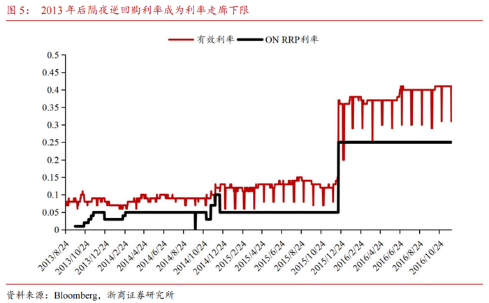 由于流动性外溢至非银机构,隔夜逆回购利率(ON RRP)最初是为配合在流动性充裕环境下加息的目标而设立。联储QE后流动性蔓延至非银机构,2008至2015年0利率下限成为利率走廊底部(联储并未对持有冗余流动性施加惩罚措施,因而有效联邦基金利率作为名义利率不会低于0)。但一旦联邦基金目标利率高于0下限,由于非银机构无法将钱直接存入联储超额准备金账户,仅靠超额准备金利率难以将市场利率稳定维持在联邦基金利率目标区间内。