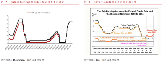 在充分准备金的货币政策环境(Ample Reserves)下,联储依旧通过超额准备金利率和隔夜逆回购利率来实施其货币政策,但超额准备金利率与市场利率之间的利差将不断收窄,因此超额准备金利率作为走廊上限并不稳固。为应对流动性收紧带来的冲击,联储于2021年引入常备回购便利(SRF)作为利率上限的补充,该设施与贴现窗口相比,一是能够对非银机构贷款,二是可以减轻向央行借钱对金融机构造成的声誉损失(更不易被市场理解为是因流动性问题而被迫向联储高息借款)。