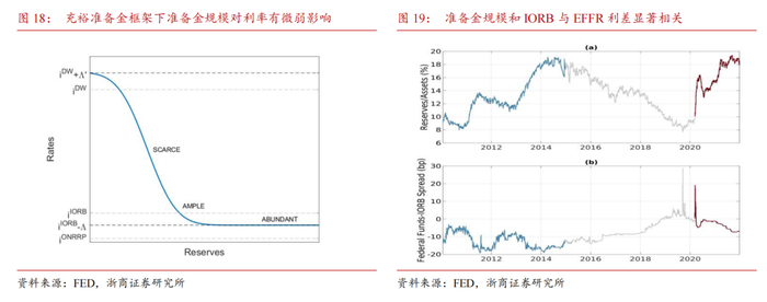充裕准备金环境下市场利率对准备金规模不敏感,利率走廊重要性上升,因为银行体系中有大量的准备金,公开市场操作无法有效引导FFR。美联储使用超额准备金利率(IORB)和隔夜逆回购协议 (ON RRP)利率来影响有效联邦基金利率(EFFR)。