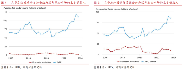 融出方面,主要是政府支持企业(GSEs,准政府机构,便利部分居民群体信贷,例如住房、农民、学生等),特别是联邦住房贷款银行(Federal Home Loan Banks),由于不符合获得超额准备金利率的资格,无法从美联储获取准备金利息,因此成为了危机后时期的联邦基金市场的主要贷款人。
